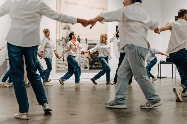 Kauno paveikslų galerijoje paskutinį spalio mėnesio šeštadienį tarp Vilniaus tapybos trienalės darbų mus pasitiko didžiulis judantis paveikslas. Akinamo baltumo staltiese, bananų kekėmis, mezgimo siūlais ir lauko gėlėmis nuklotas stalas talpino būrį judėjimo sunkumų turinčių senjorų ir šešetą šiuolaikinio šokio profesionalų (Erika Vizbaraitė, Goda Laurinavičiūtė, Gabija Blochina, Mantas Stabačinskas, Marius Pinigis ir Adrianas Carlo Bibiano). Už stalo susėdę atlikėjai skendo švelniai gelsvoje šviesoje ir atrodė it nužengę tiesiai iš „Paskutinės vakarienės“. Vis tik pirmosios vakaro miniatiūros „Šokti 1000 metų“ nuotaika labiau panašėjo į gyvenimo šventės pradžią, o ne pabaigą.