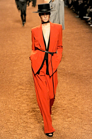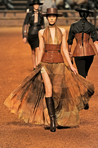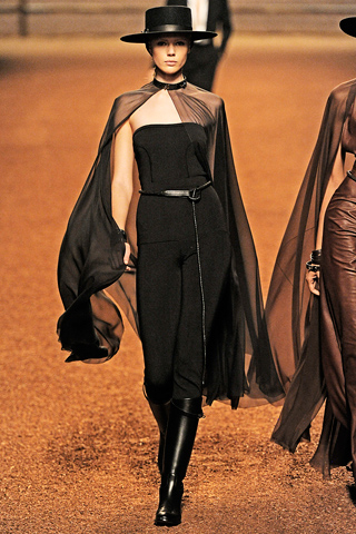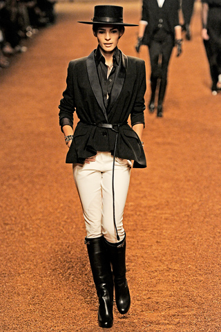 Kokia gi pramogų industrija, jei pirmas renginio veiksmas nepribloškią, nesukelia intrigų ir šnabždesių salėje? Hermès čia pasitelkė arklių jodinėtojo kostiumą. Karlie Kloss, tarsi antra oda pasipuošusi juodu odiniu apdaru, sėlino po podiumo lempomis, mosikuodama botgagu. Liesa, trapi, seksuali Kloss ir šiek tiek fetišistinis jos įvaizdis abejonių nepaliko: šio vakaro nuotaika bus būtent tokia, kaip ir Karlie.