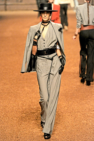 Šią kolekciją kūręs Gaultier tarsi svaidosi savo meistryste, podiumu plaukiant paprastiems, net asketiškiems, tačiau be galo efektingiems įvaizdžiams. Švarkus jis pasitelkė, kad apnuogintų kūną, o iš jojimo kelnių sukūrė šortus. Atkreipkite dėmesį ir į tiesiog įsmaugtas per liemenį kelnes bei žvilgančius santūrius aksesuarus, puikiai papildžiusius nemarią klasiką – Hermès kelioninį krepšį.
