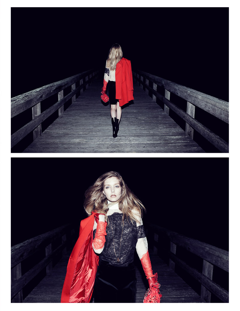 Vienišas išduotas angelas klajoja po nežinomas keistas vietas. Šiek tiek baugus merginos ir vietų, kuriose fotografas Lachlan Bailey ją įamžino, santykis. Ne, jos nėra šiurpios ir apleistos. Tiesiog tuščios. Ir labai nejaukios… Tačiau stulbinantis, bet itin šaltas Mathilde Frechon grožis iš tiesų labai dera prie aplinkos. Išsigandusi, juodais ir raudonais drabužiais pasipuošusi naktį ji eina mediniu tiltu, o kaži kas ją seka su žibintuvėliu rankose. Tai gana freak‘iška fotografo vizija spalio numerio Vogue Nippon versijai. Tačiau šis fotografo žingsnis nebuvo klaidingas, o, atvirkščiai, labai tikslingas. Toks jo fotografavimo būdas ne tik sukūrė gana keistą jausmą ir atmosferą nuotraukose, bet ir pabrėžė žymių dizainerių drabužių stilingumą ir originalumą. Good job, Lachlan Bailey!