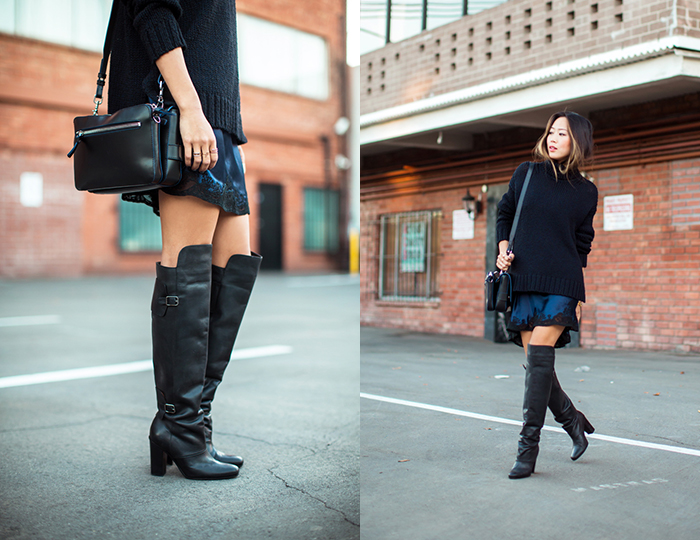 Pirmas metų penktadienis, pirmasis metų savaitgalis! Nėra laiko kada ilsėtis, o gal atvirkščiai – po siautulingo vakarėlio savaitės viduryje vis dar nesinori keltis iš lovos? Tokiu atveju šį penktadienį siūlome dvipusį įvaizdį. Tai oversized stiliaus megztinis, suderintas su šilkine suknele, primenančia naktinius. Megztinis apsaugos nuo šalčio lauke, o įlindus kur nors vidun, nebaisu ir jį nusivilkti. Šis įvaizdis nuostabiai atrodo su batais virš kelių, be kurių, regis, šį sezoną neišsiversime. Tinklaraščio „Song of Style“ autorė šiam deriniui pasirinko ALC megztinį, Karen Millen suknelę bei H&M batus.