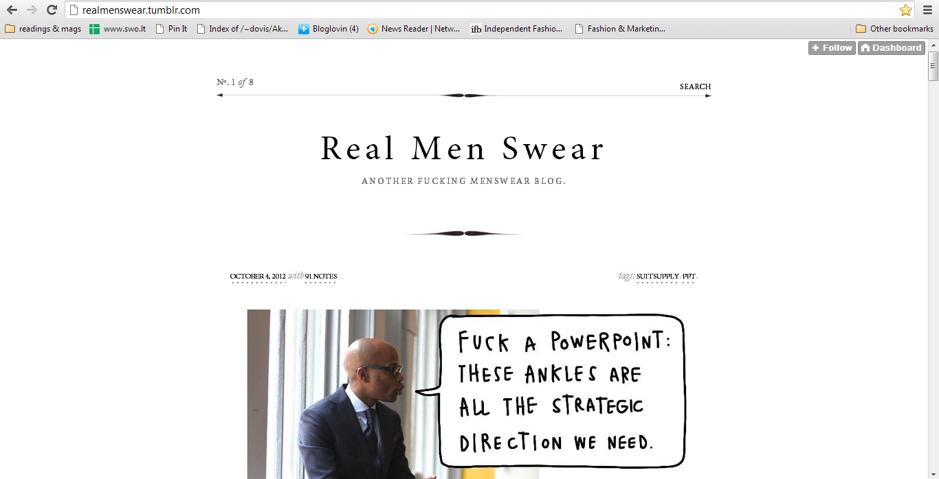 Tikri vyrai keikiasi, ne kitaip. Ne, ne kasdien, tačiau kai reikia, grubus žodis nepamaišo. Bent jau taip teigia šio tinklaraščio (Real Men Swear) sumanytojai, mados fotografijas padailinę komiksų pokalbių debesėliais. Savotiškos iliustracijos! Mūsų favoritas – retweet funkcija vietoj pokalbio, tikra kalbos išraiškos viršūnė. Panaršykite ir papasakokite, ką manote patys.