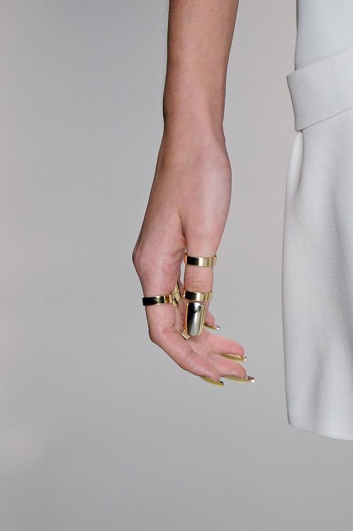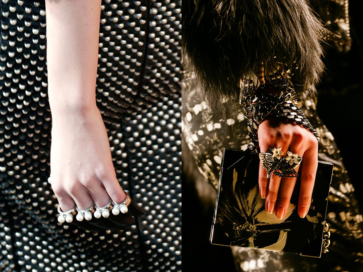 Chanel siūlo tamsiai pilko atspalvio, prabanga tviskančius žiedus, protingai išdėliotus nuo įprastos jų vietos – piršto apačios – iki pačių pirštų galiukų. Lanvin rudenį džiaugiasi užrašu „Cool“, kurį kasteto pagalba gali ištatuiruoti kam nors ant kaktos, o Alexander McQueen kolekcijos perlai virsta pirštinėmis – tai netikėtas lobis ekscentrikams. Nuo Roberto Cavalli iki Christian Dior podiumų – papuošalas apdovanoja rankas išskirtinu dėmesiu.